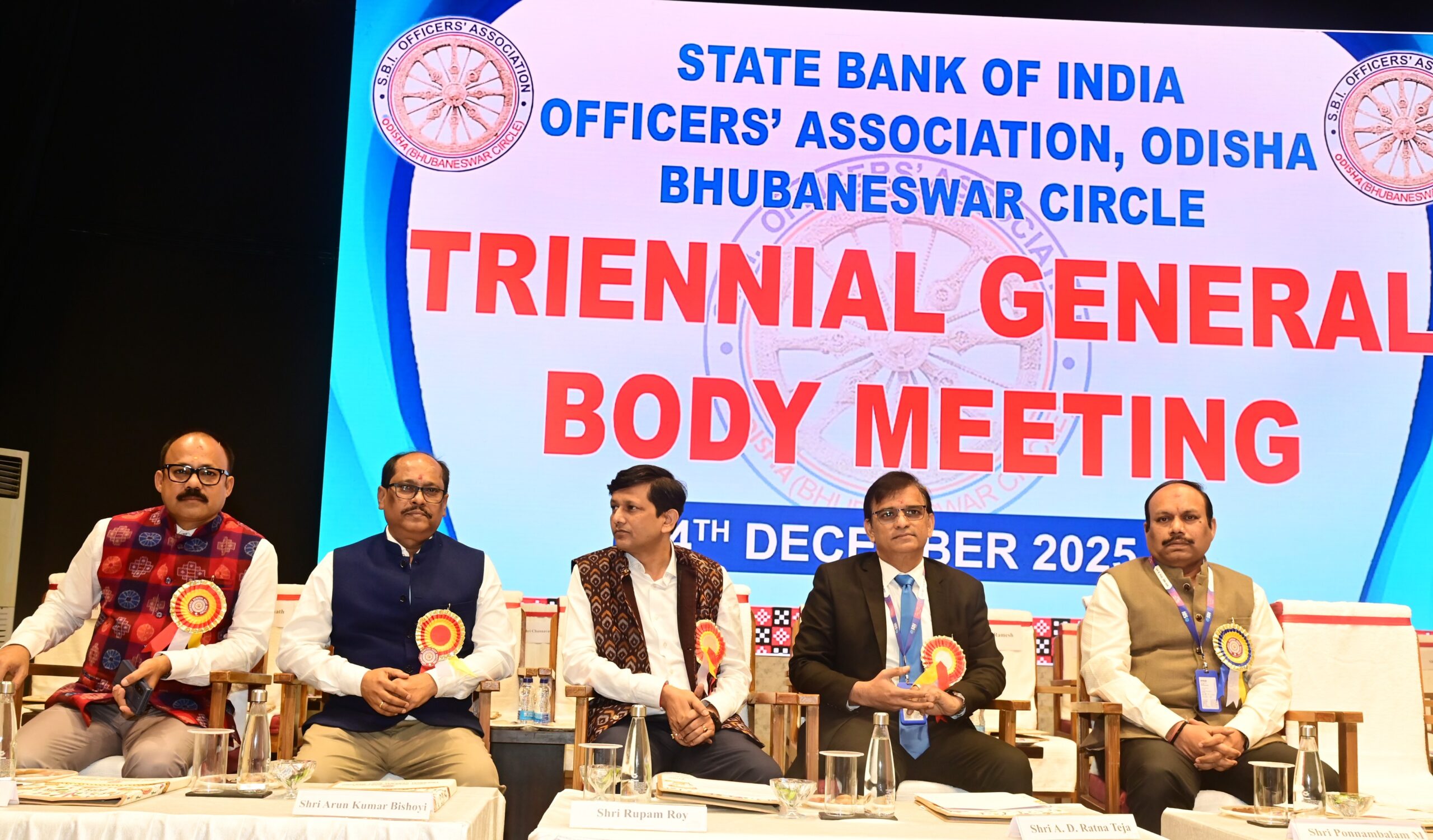 swa news : The Triennial General Body Meeting of the State Bank of India Officer’s Association (SBIOA) Bhubaneswar Circle was held on 14th December 2025 at the Convention Centre, KIIT Campus-6, Bhubaneswar.Sri A.D. Ratna Teja, Chief General Manager, SBI Bhubaneswar Circle, Sri M Ponnambalam, Chief General Manager (HR) and Shri Rupam Roy, General Secretary, AISBOF and AIBOC had graced the event as Chief Guest, Guest of Honour and Keynote Speaker respectively.